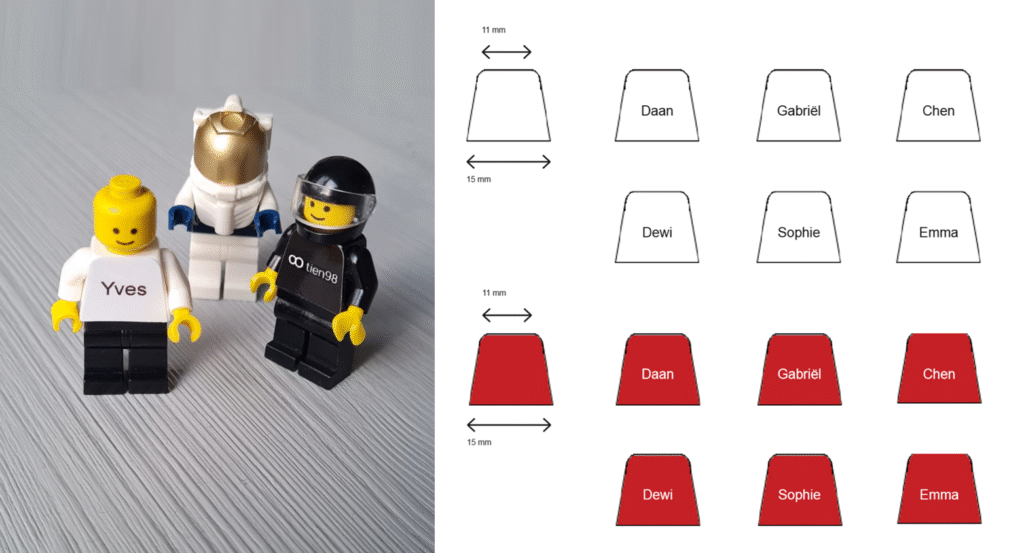 Voor de 7e verjaardag van Yves LEGO naamstickers ontworpen. Stickers met namen van klasgenoten erop. De stickers pasten precies op het bovenlichaam van een LEGO minifiguur. Elk klasgenootje kreeg een LEGO minifiguur met zijn of haar naam erop. Hieronder een weergave van de naamstickers en uitnodiging voor het kinderfeestje.